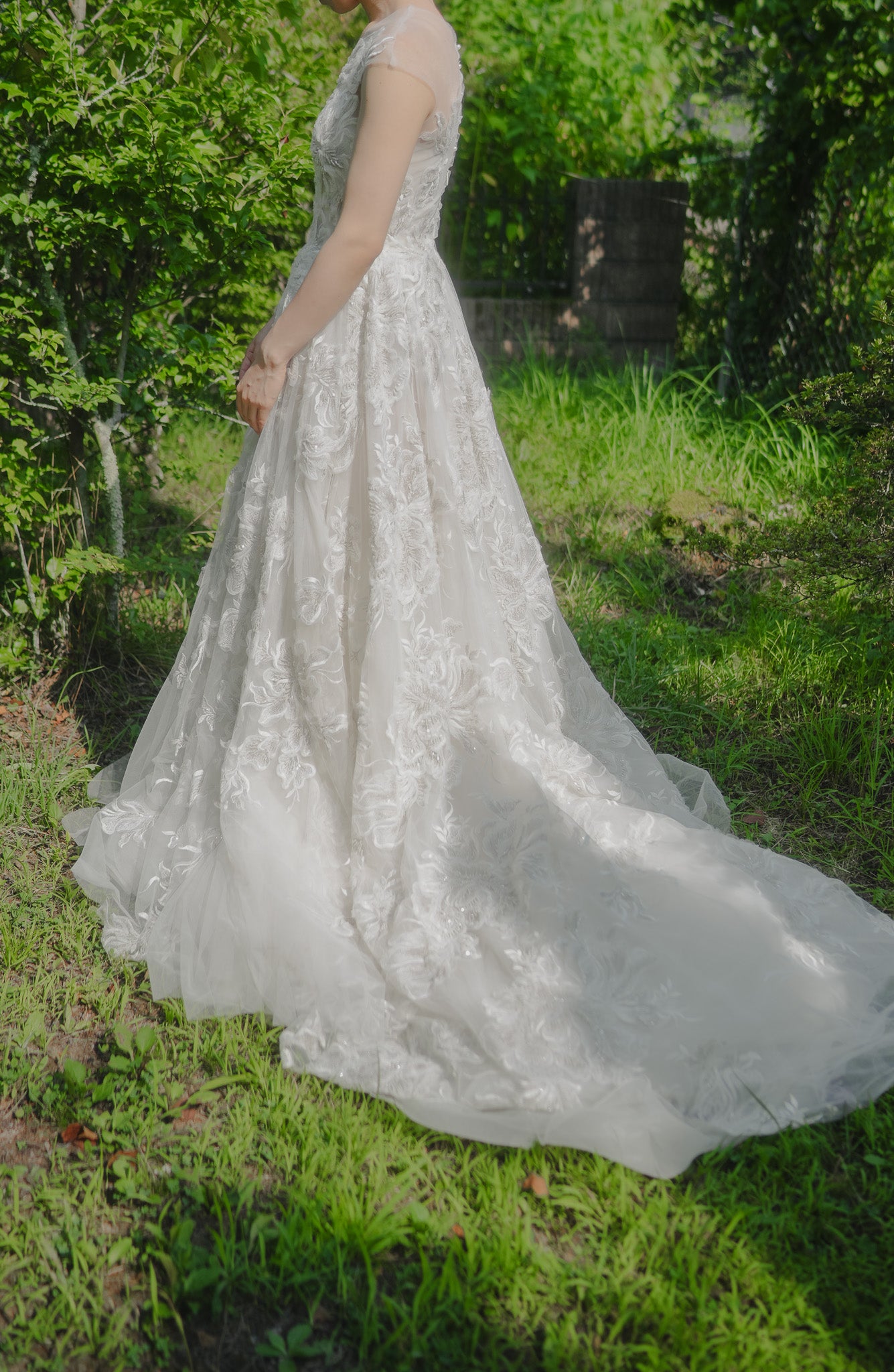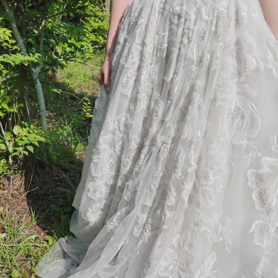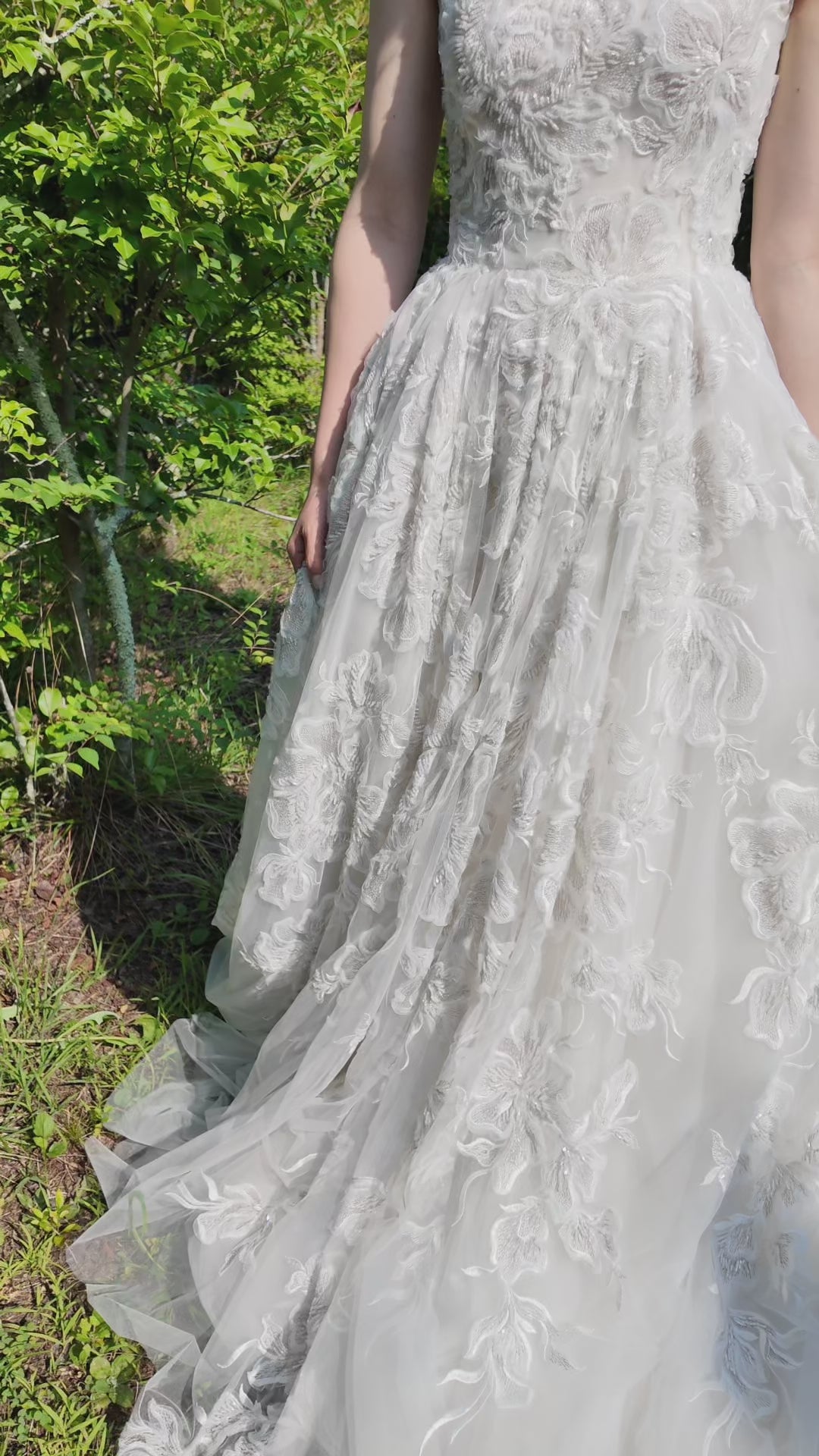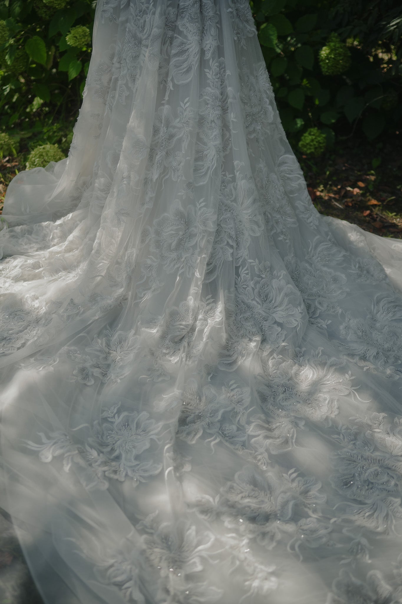 シルバーの繊細な刺繍と透明感のあるチュールが織りなす、気品あふれるロングドレス。光を受けるたびに上品な輝きを放ち、花嫁の優雅さを際立たせます。