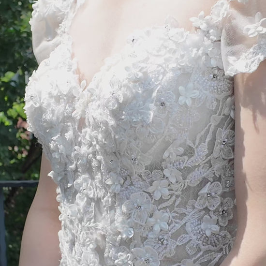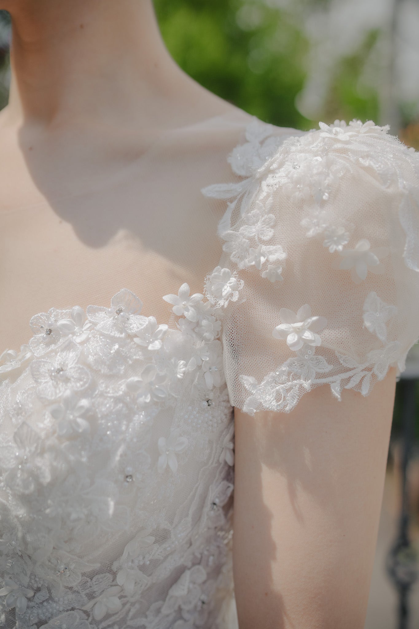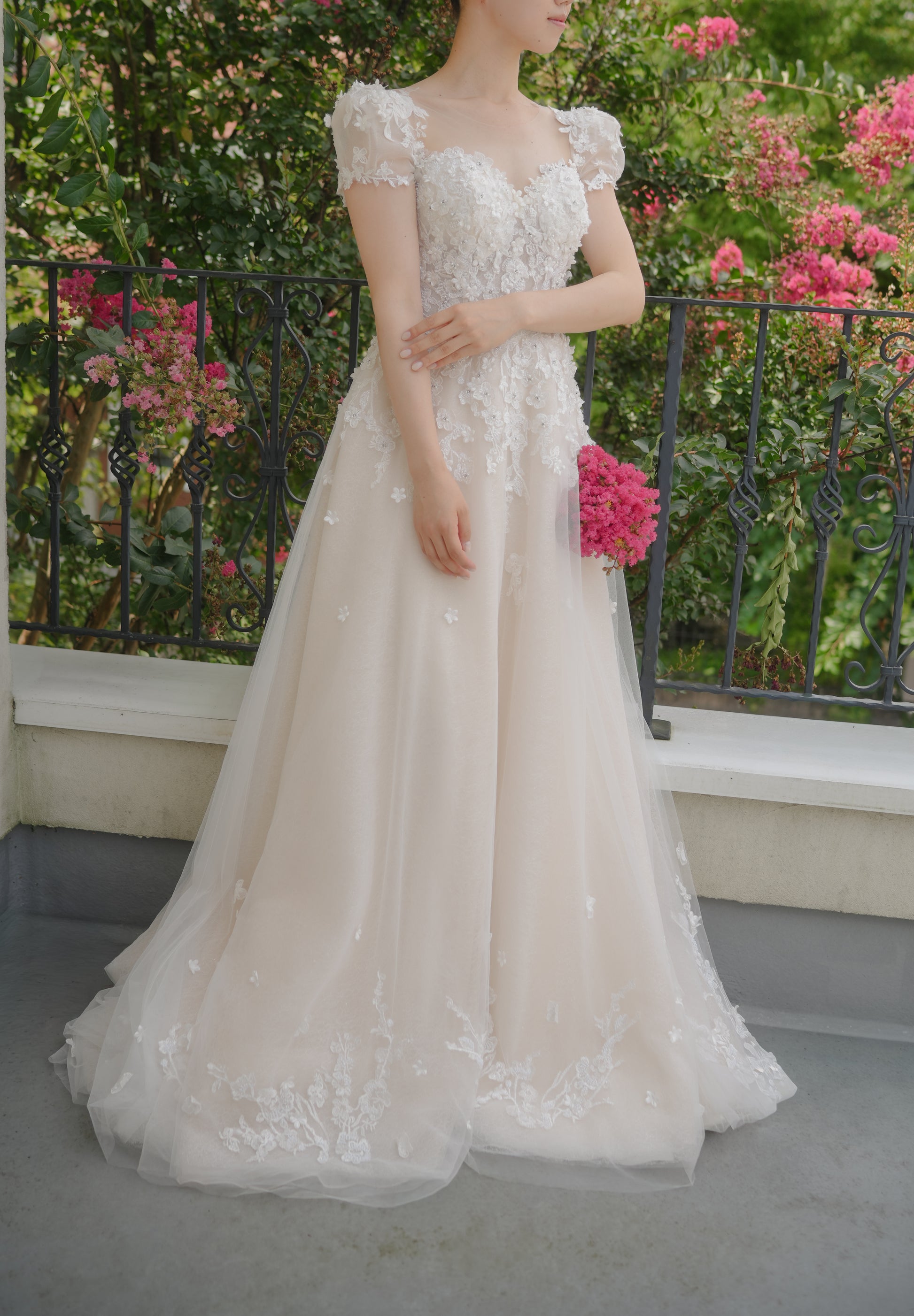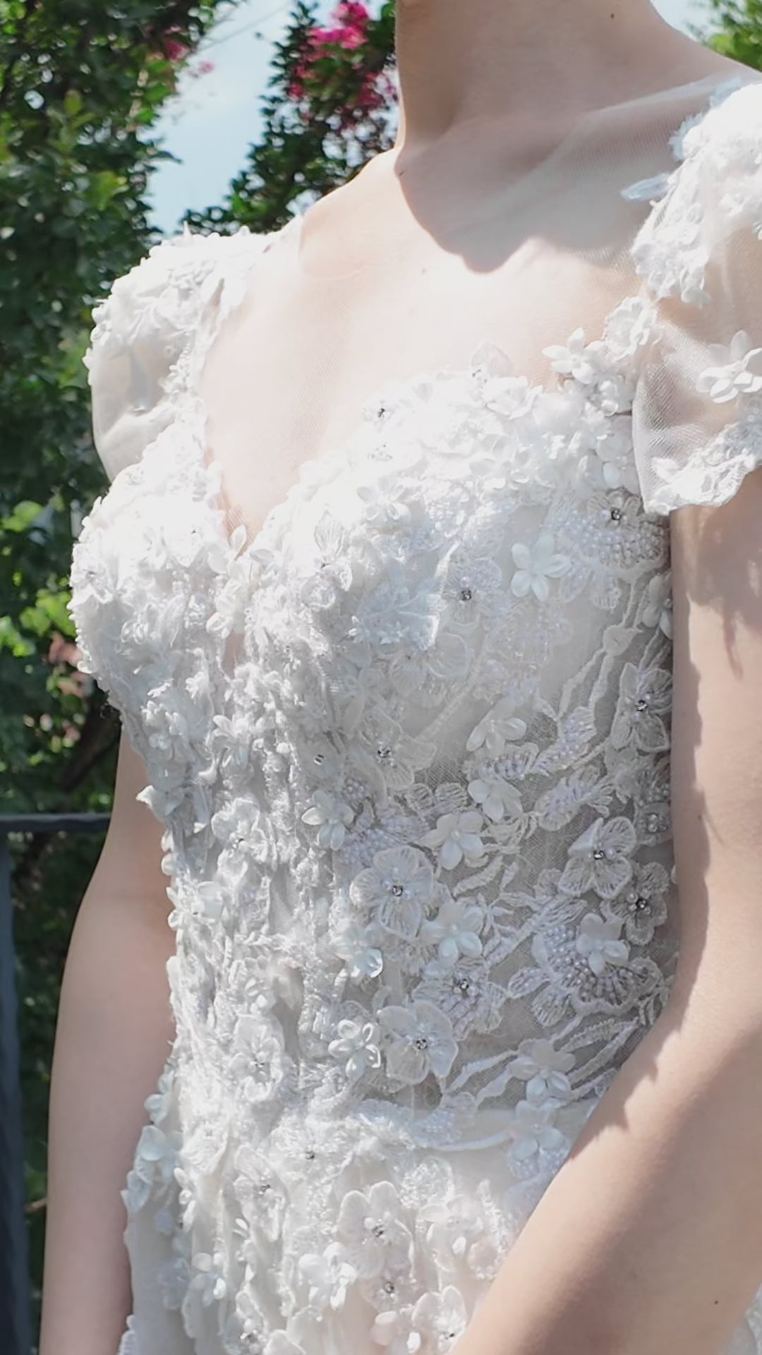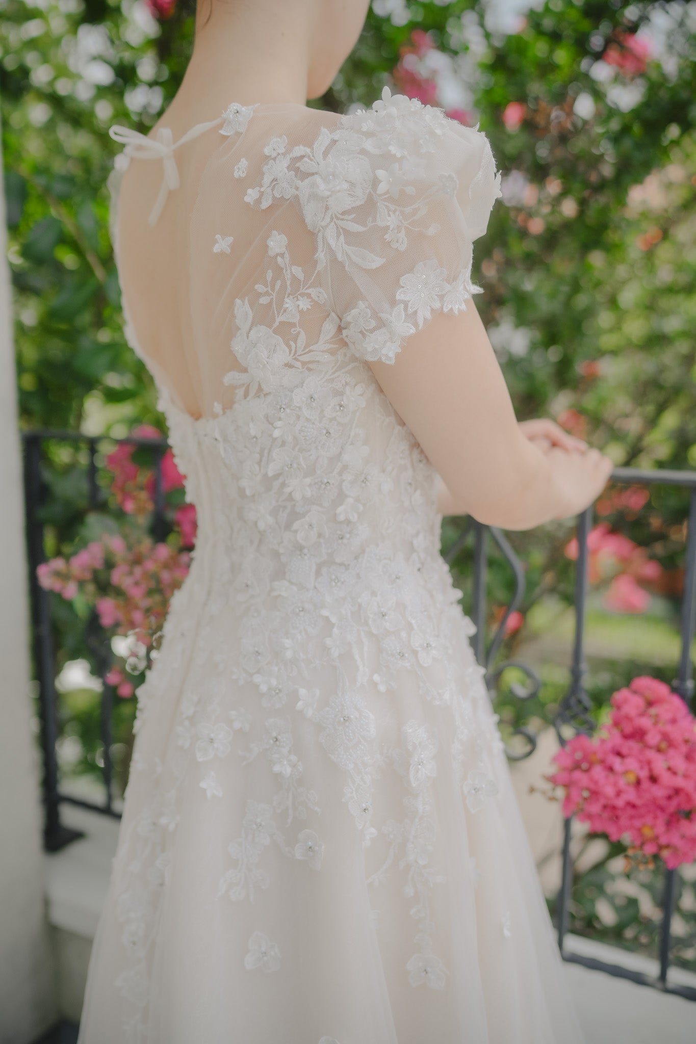 立体的なフラワーモチーフと柔らかなチュールが織りなす、ロマンティックな一着。太陽の光にきらめく小花が、まるで庭園に舞う花びらのように花嫁を包み込みます。自然の中で気品あるプリンセススタイルを叶えるドレスです。