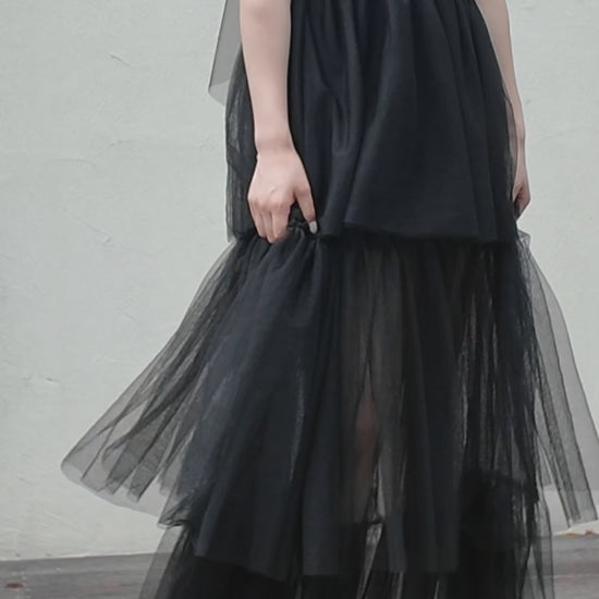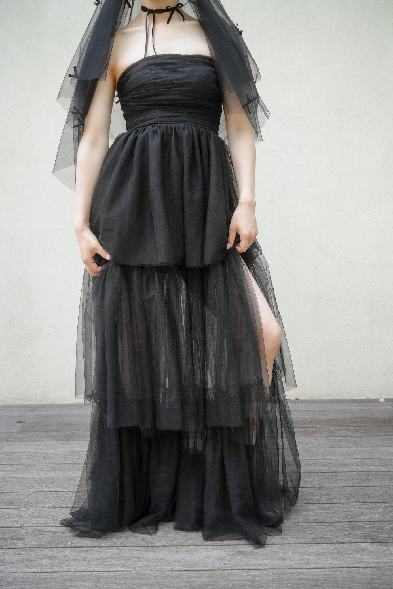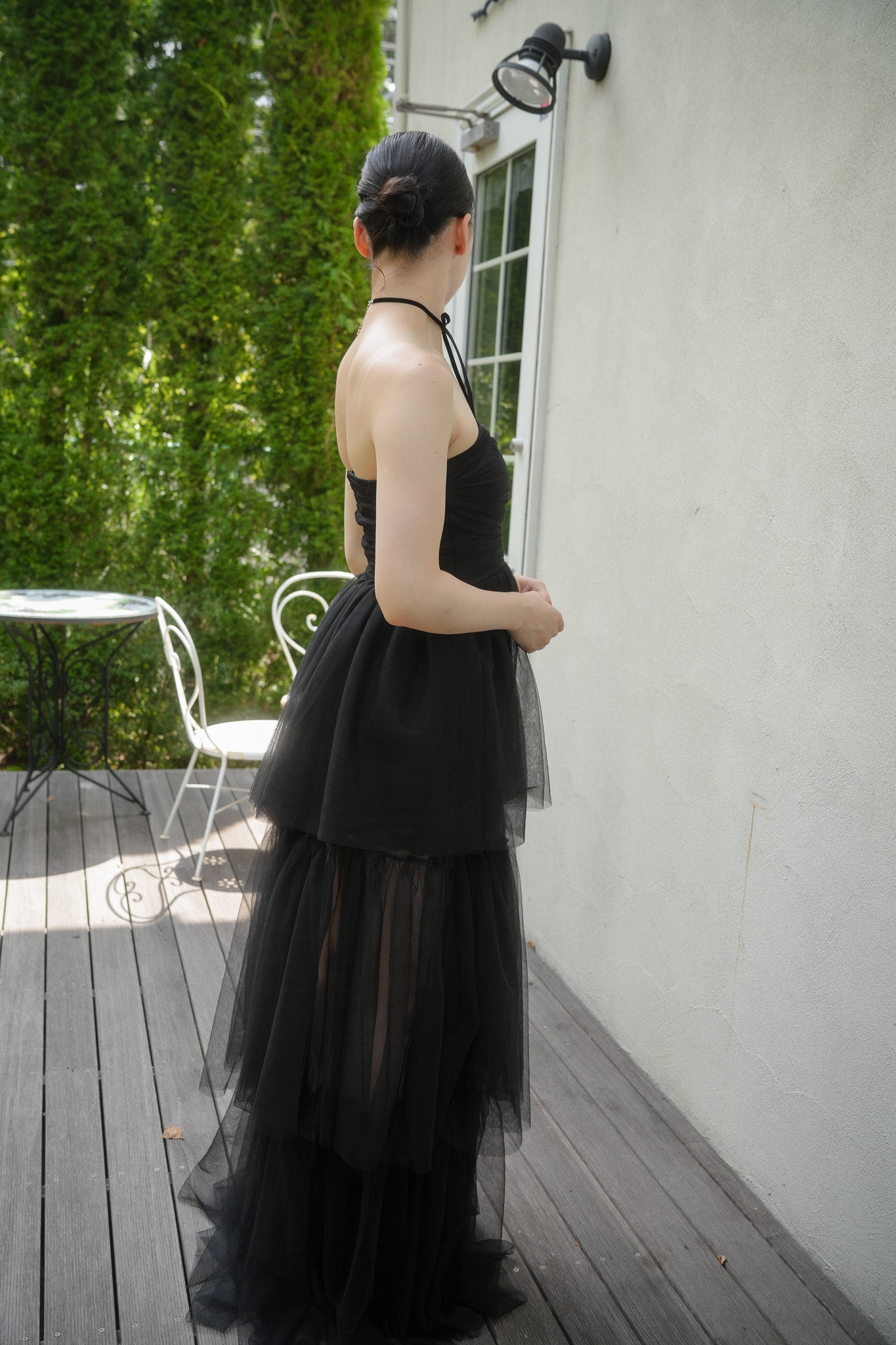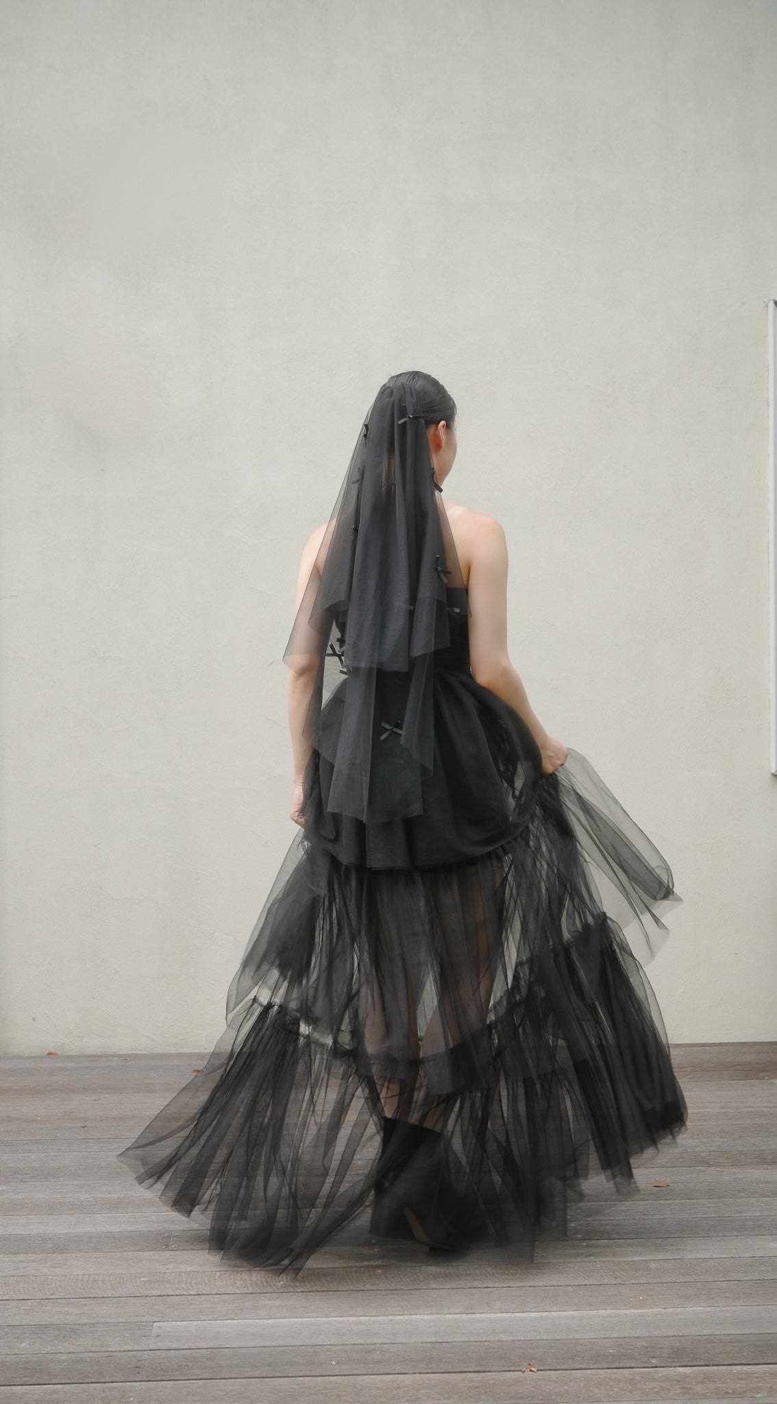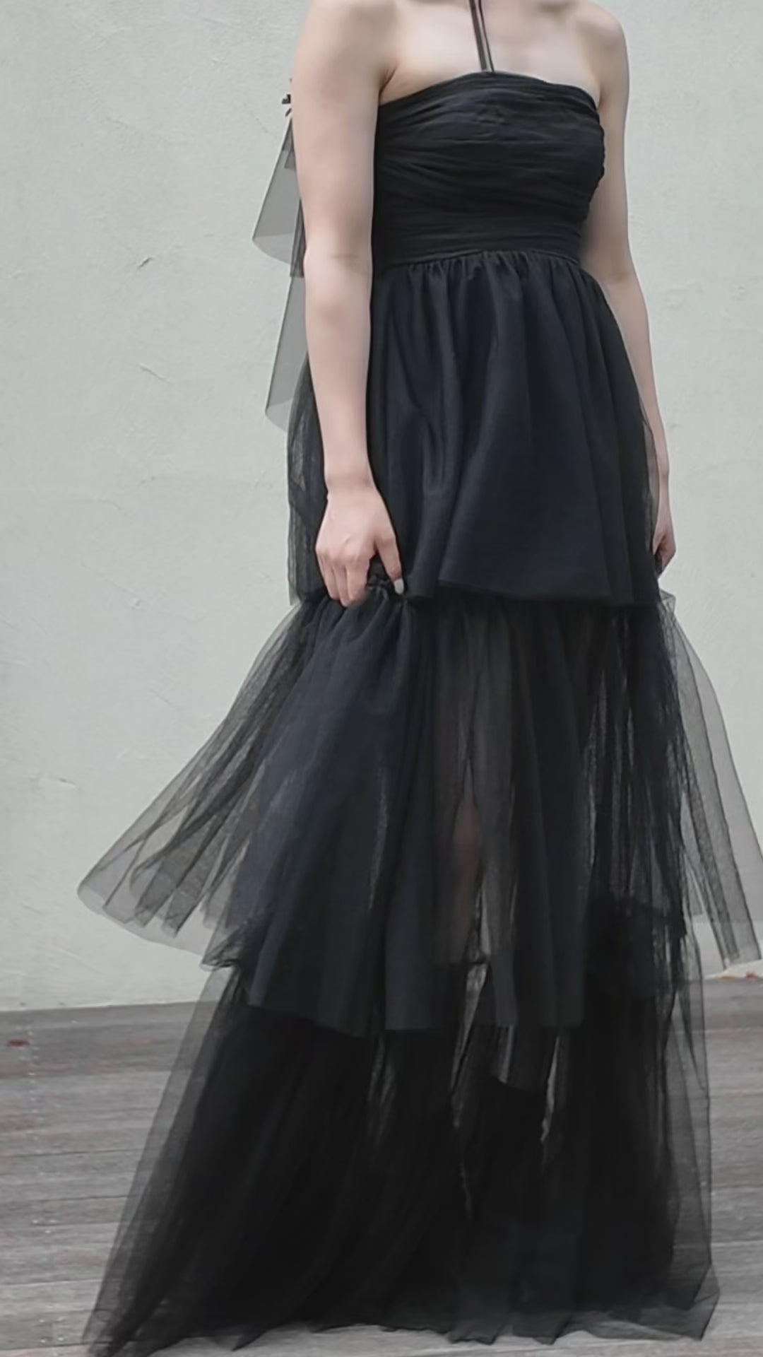 深い夜を思わせるブラックチュールが幾重にも重なり、静かな旋律のように揺れるドレス。シンプルなビスチェとティアードデザインが織りなす陰影は、可憐さとモード感を同時に引き立てます。