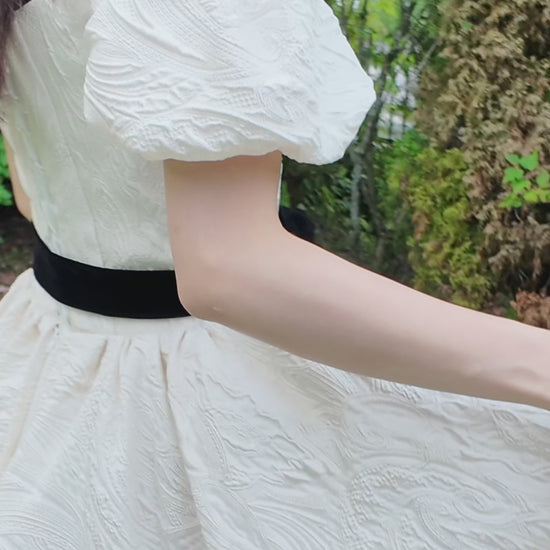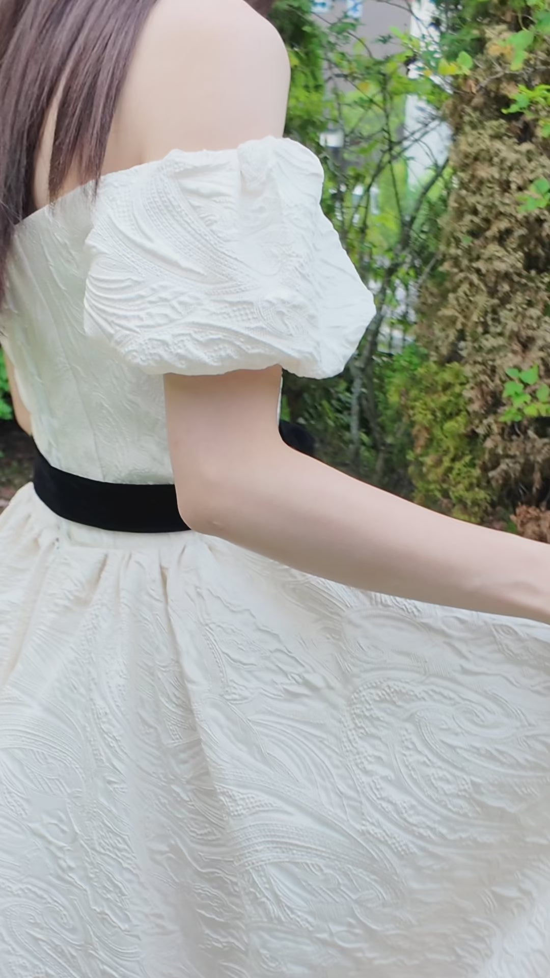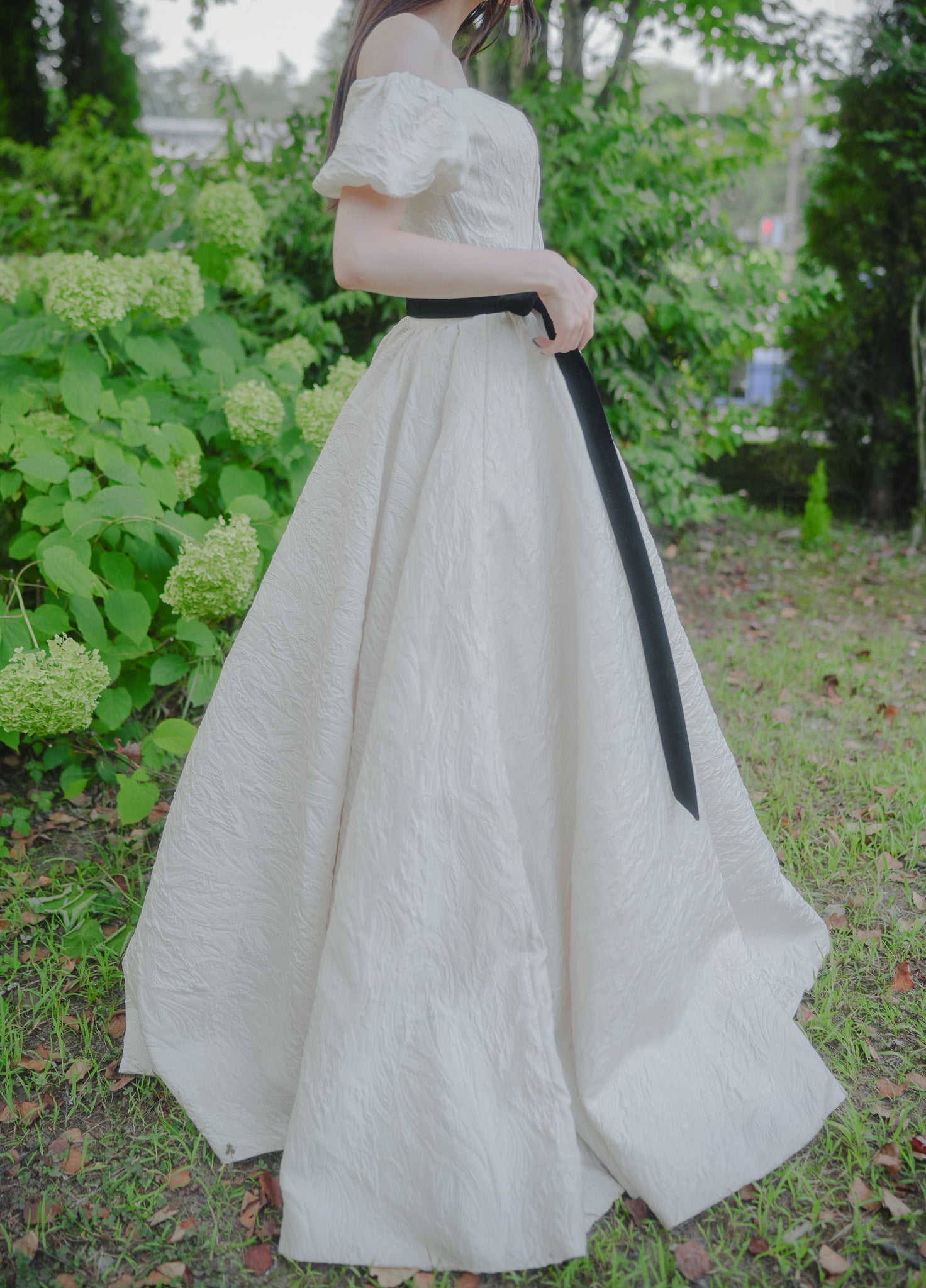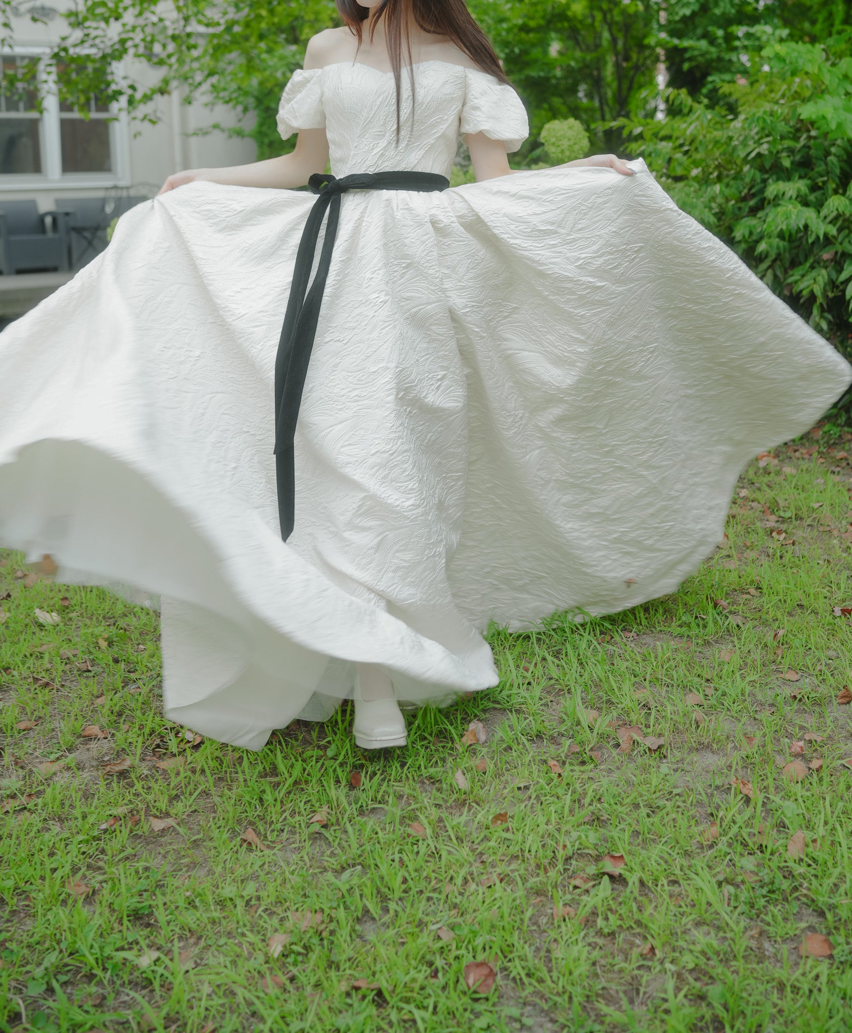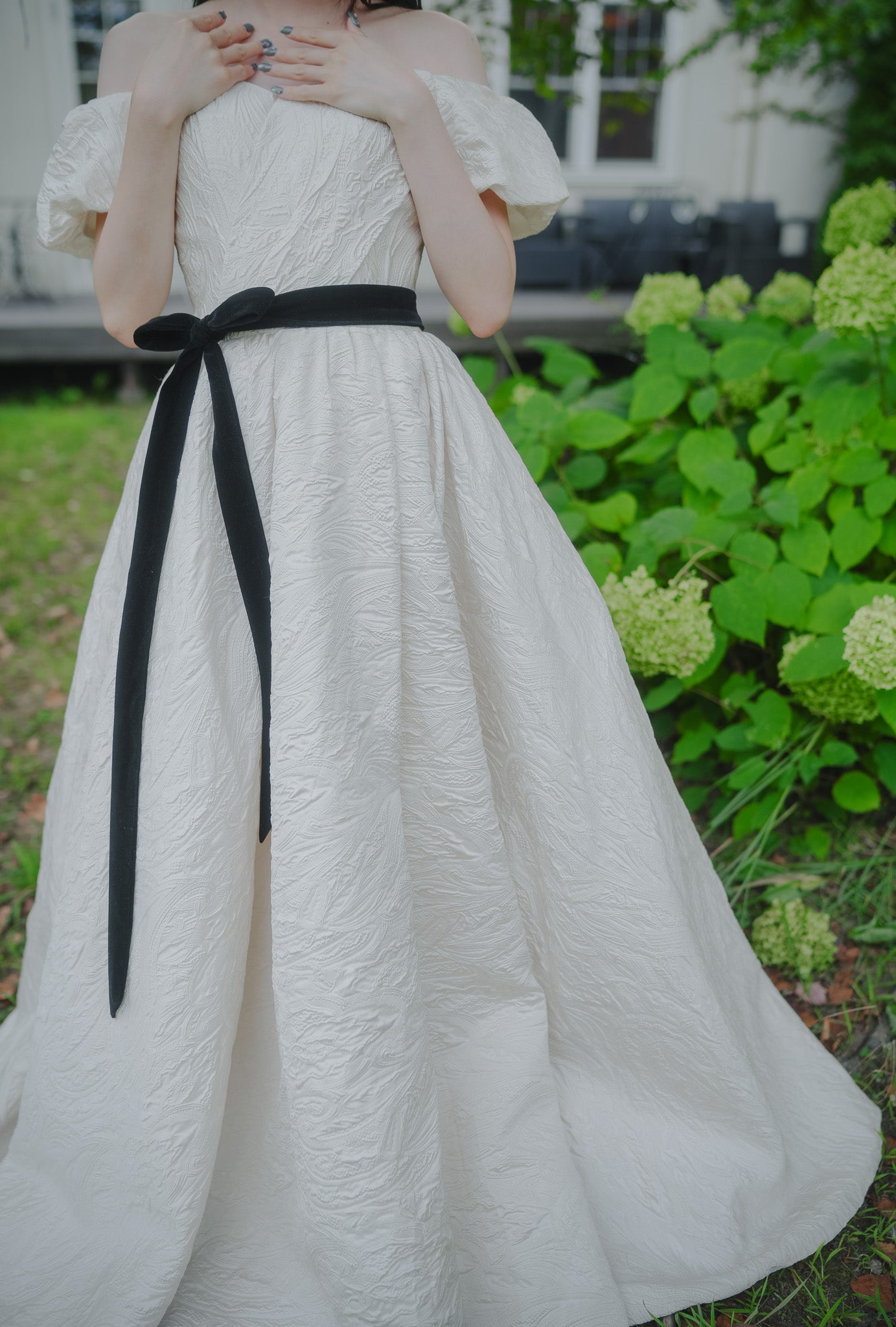 立体感のある生地と、クラシカルなオフショルダー。黒のリボンベルトがアクセントとなり、上品な気品を漂わせるドレス。まるで19世紀のヨーロッパにタイムスリップしたような、優雅で洗練された花嫁姿を叶えます。