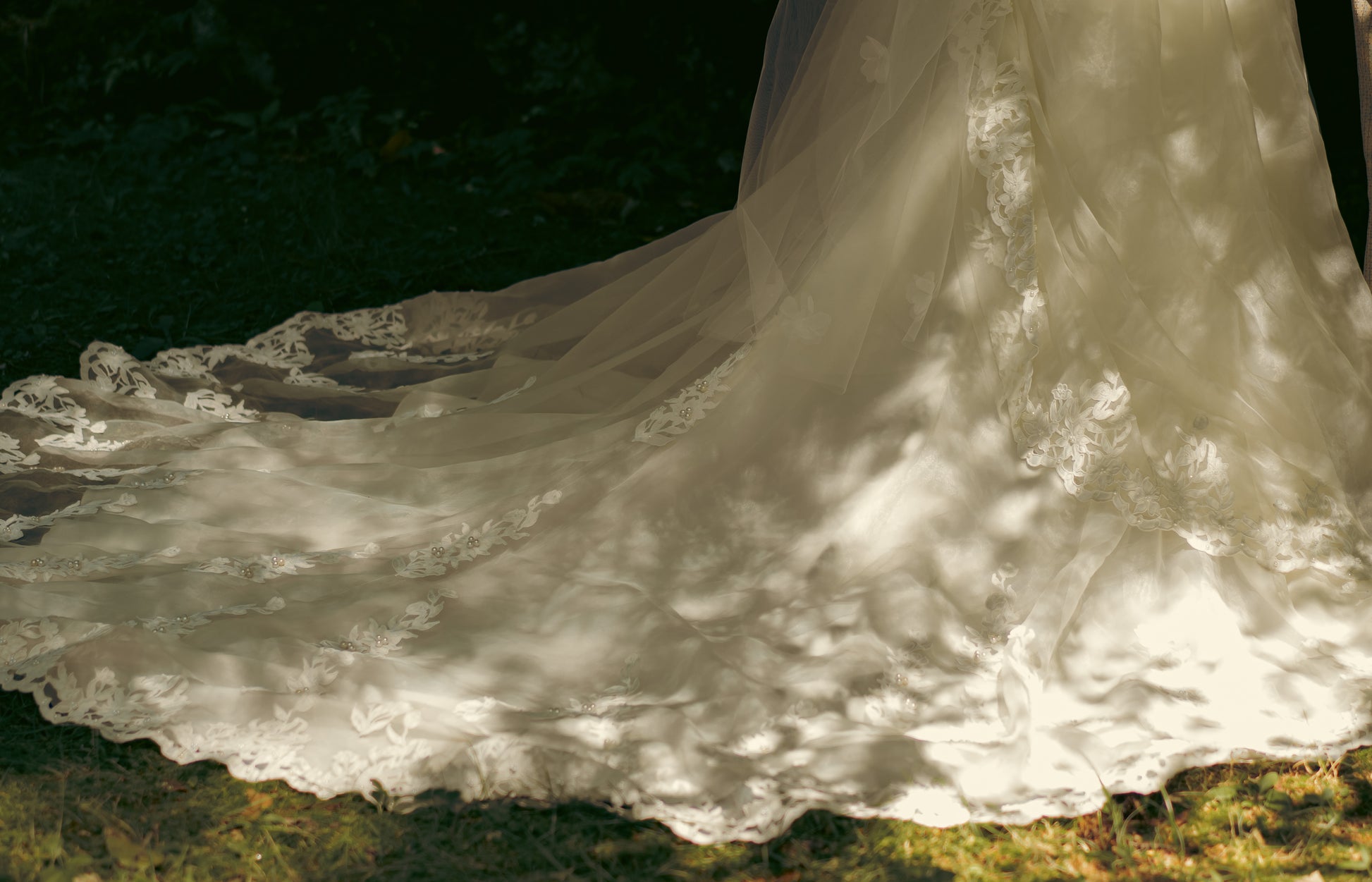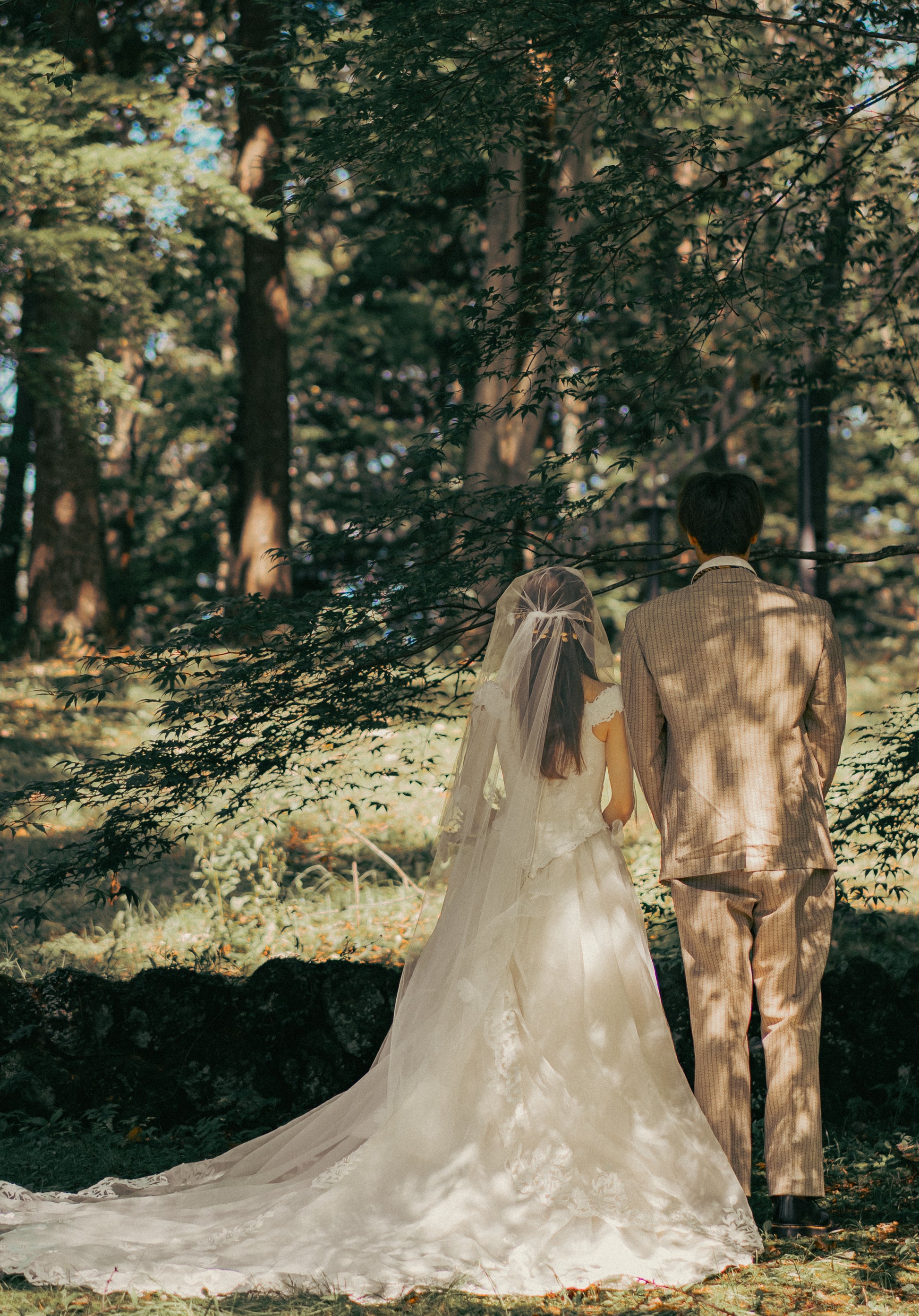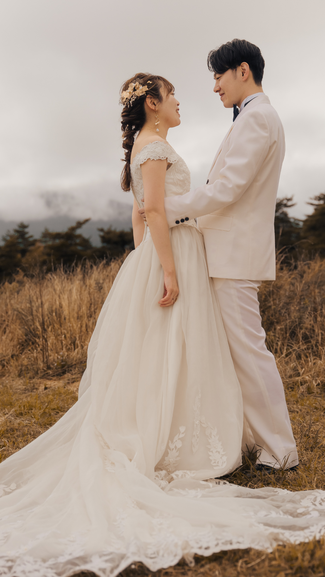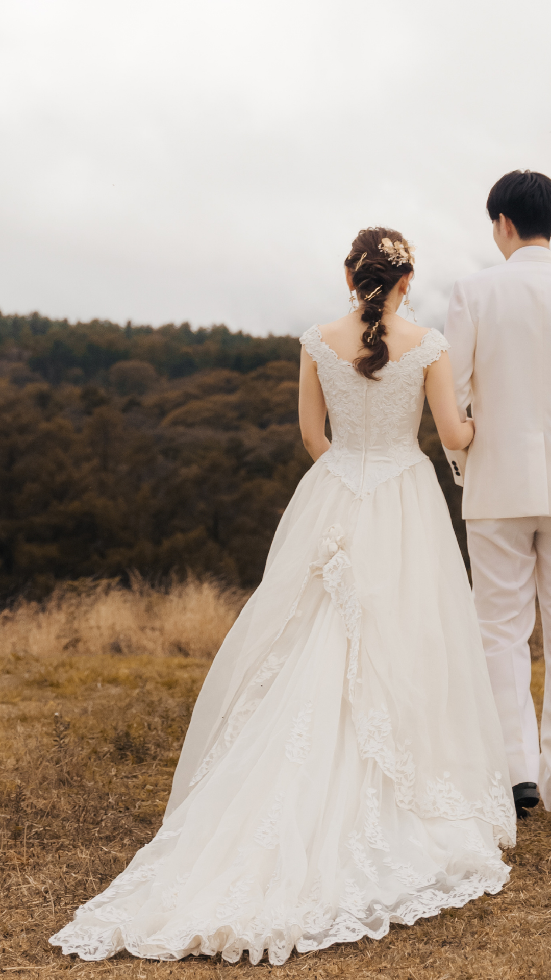 デコルテを包むレースとふんわり広がるトレーンが、クラシカルな気品の中に愛らしさを添える一着。上品でありながら、花嫁の優しさや可憐さを引き立てるデザインです。