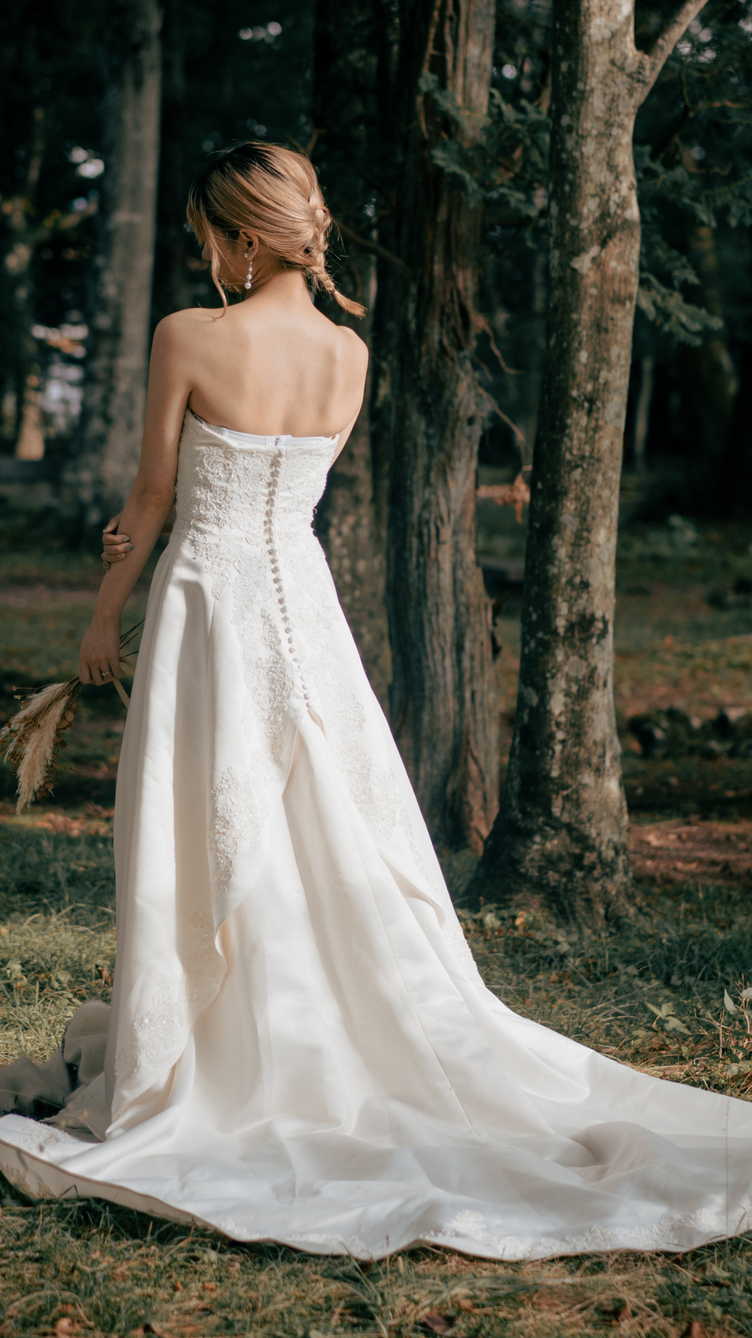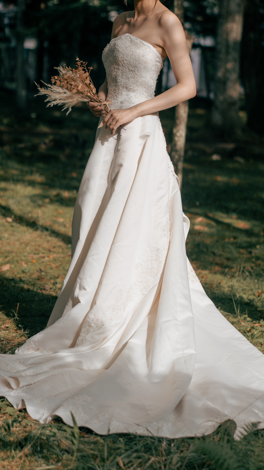 繊細な刺繍が上半身を華やかに飾り、流れるように広がるロングトレーンが後ろ姿まで美しく演出するクラシカルな一着。