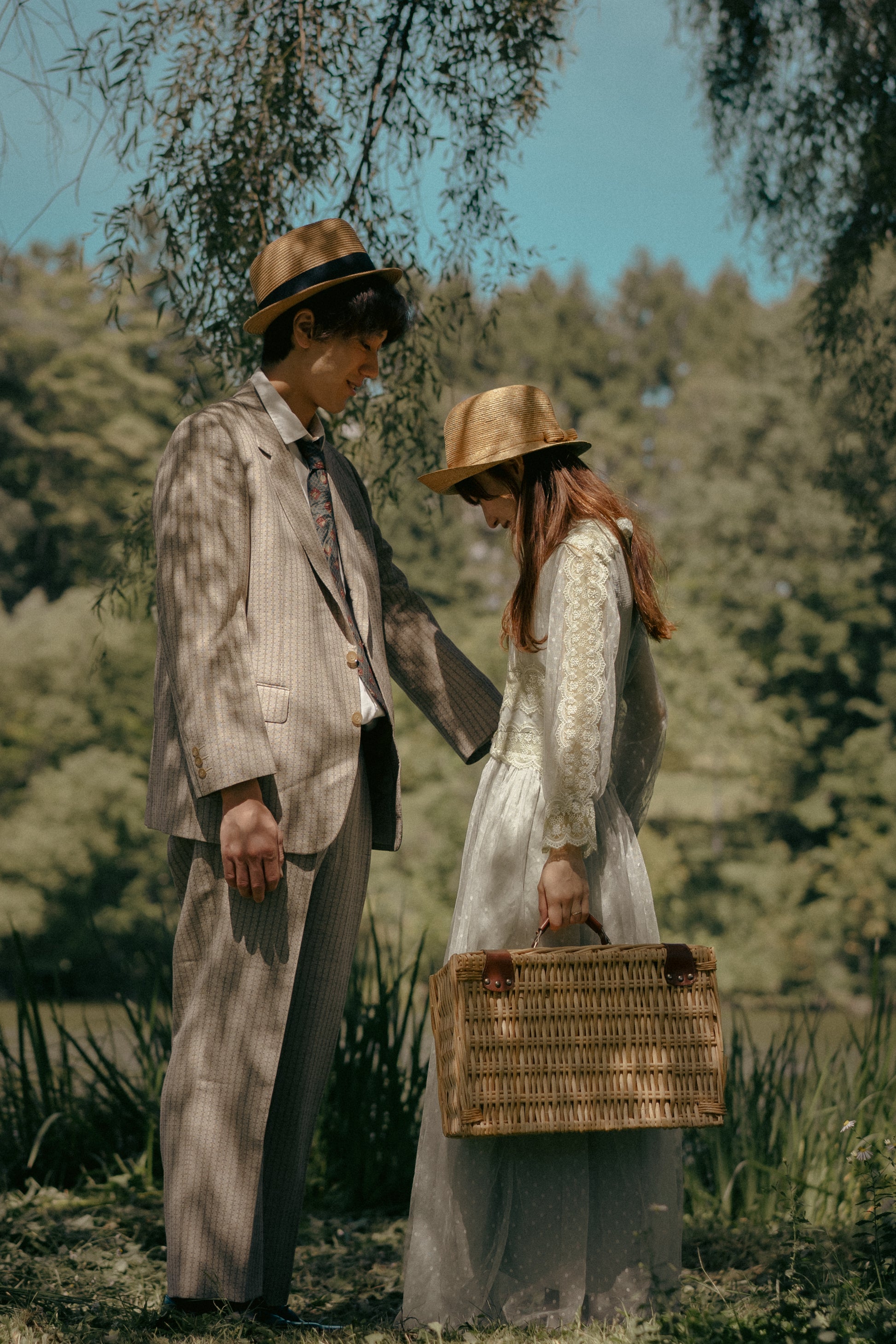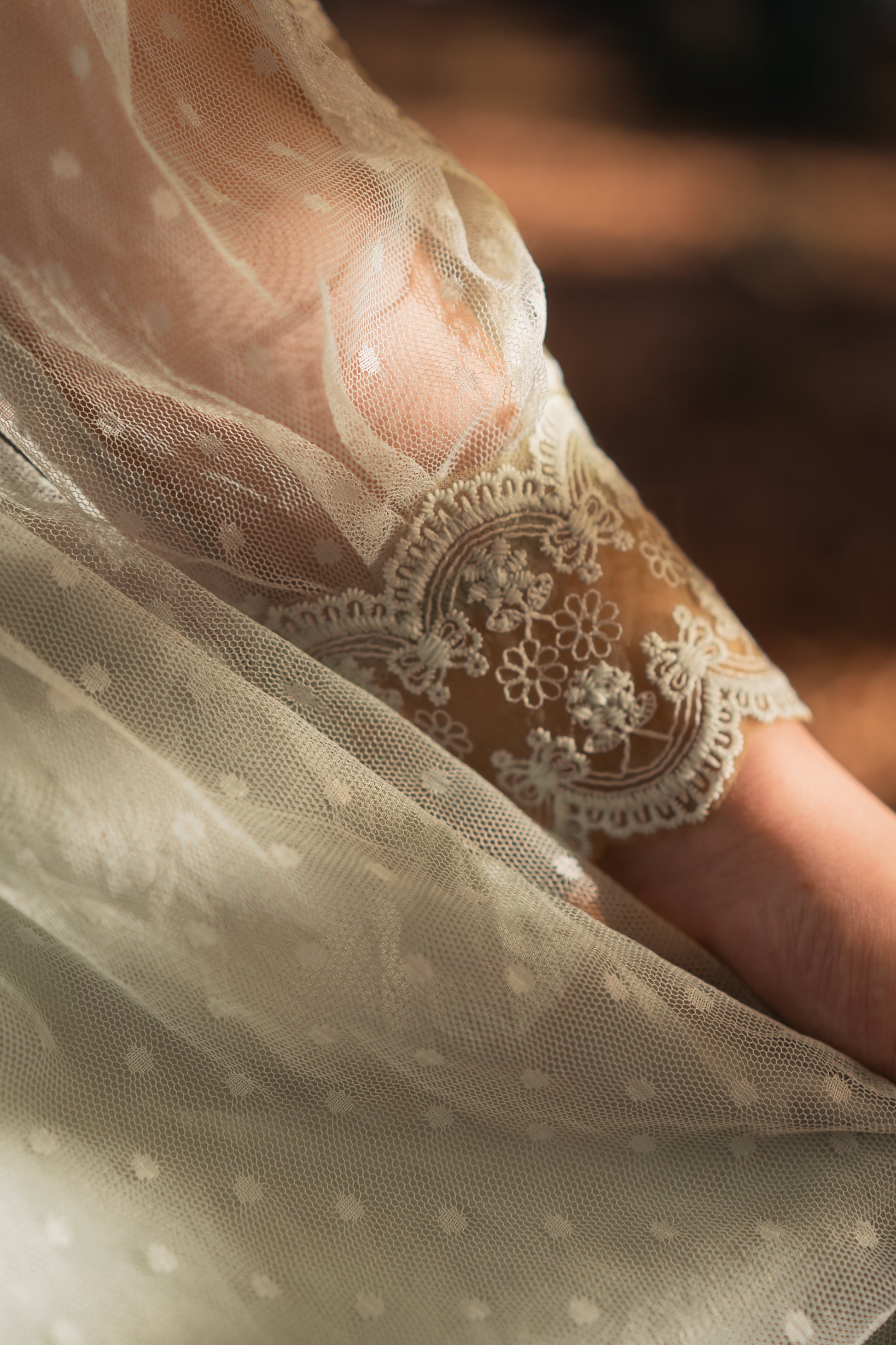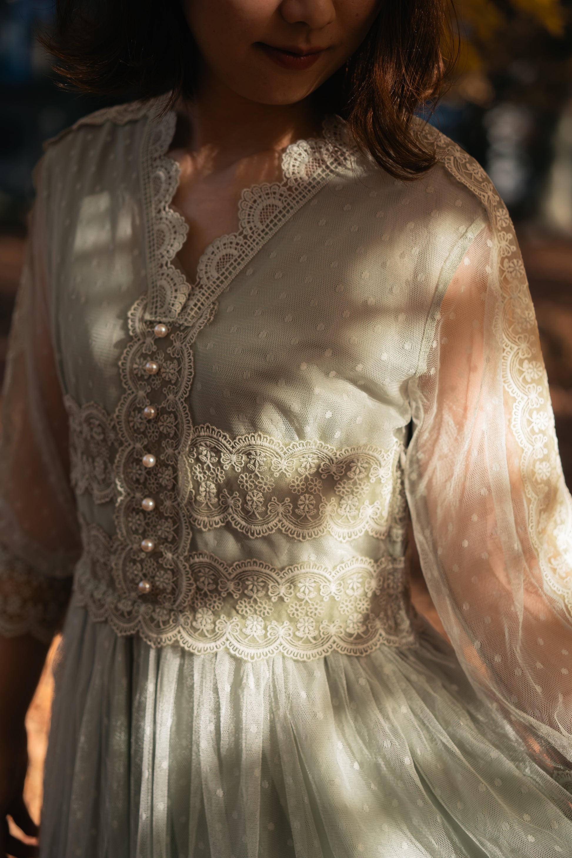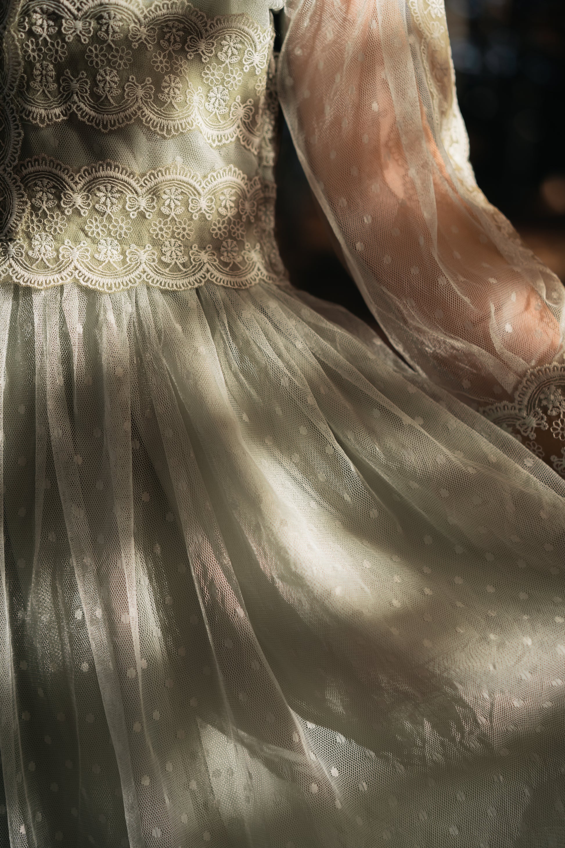 柔らかなグリーンのチュールに、繊細なレースを重ねたナチュラルな雰囲気のドレス。森や草花に溶け込むような自然美が魅力で、ウェディングはもちろん、2次会やガーデンパーティーにもぴったりの一着です。