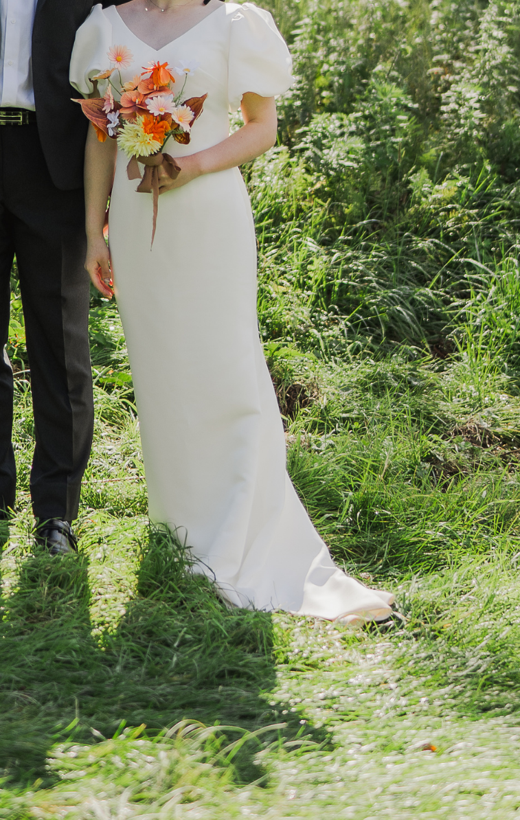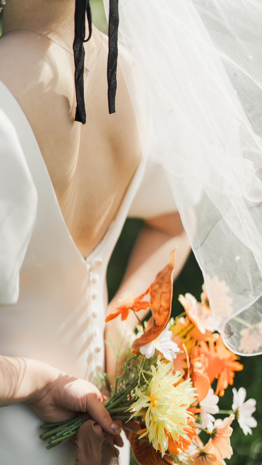 背中に結ばれた大きなリボンと、ふんわりとしたパフスリーブが愛らしいショートドレス。動きやすく軽やかなデザインは、ロケーションフォトや前撮りだからこそ楽しめる特別な一着。花嫁の可憐さと遊び心を映し出すフォトジェニックなスタイルです。